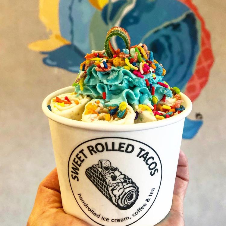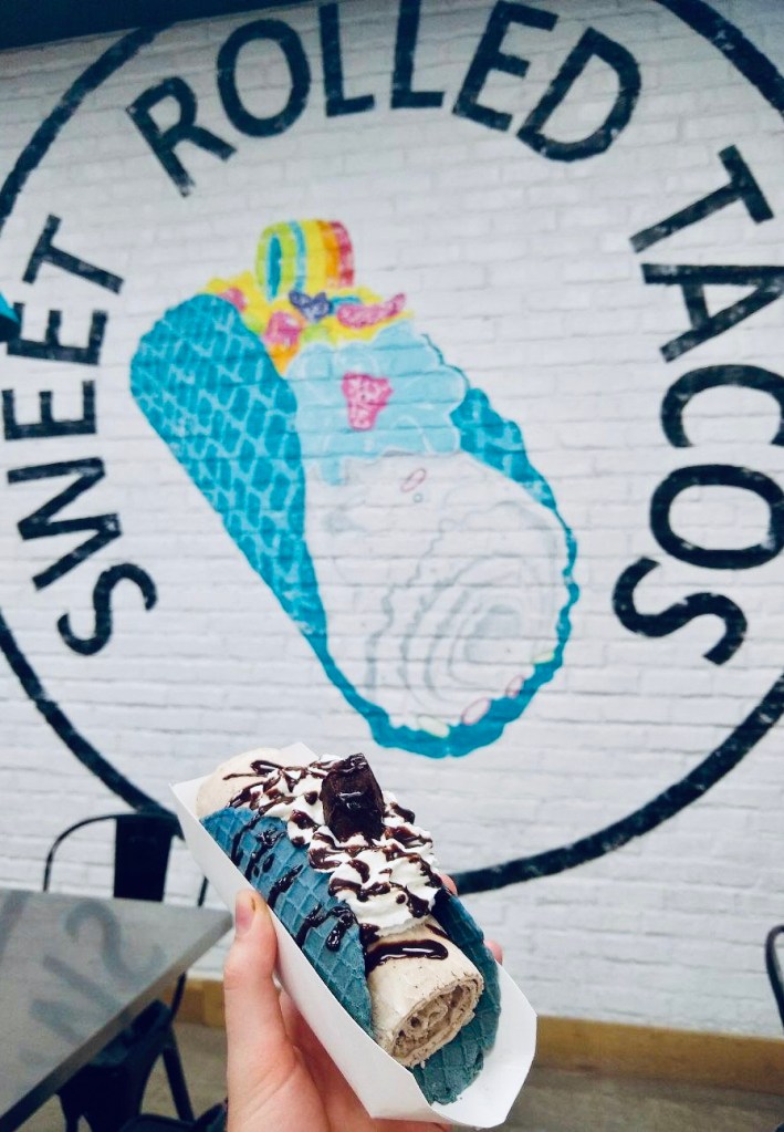 Sweet Rolled Tacos puts a special twist on the rolled ice cream trend by putting a roll in a taco. With bright colored waffle shells, unique flavors such as ube and charcoal and many delicious toppings, Sweet Rolled Tacos is an must have experience.